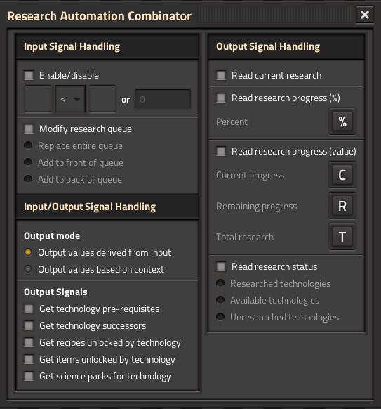 An advanced combinator that can modify the research queue and output research-related signals based on input signals.